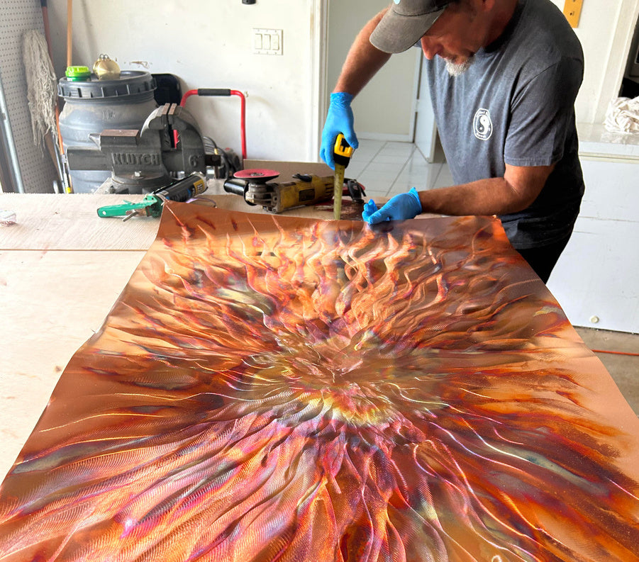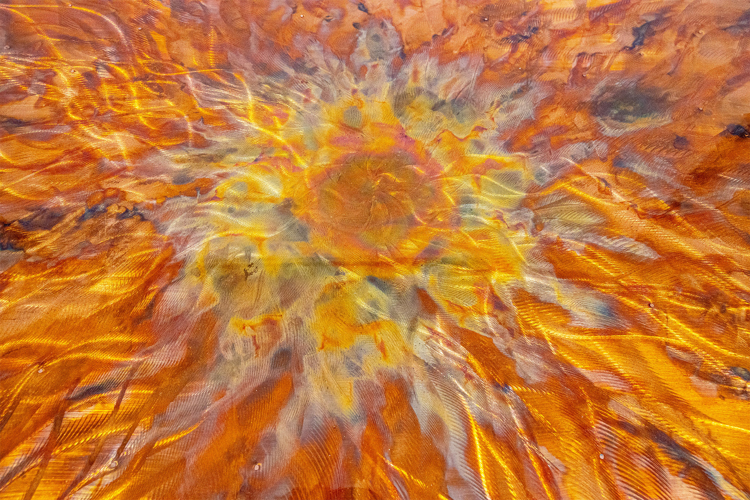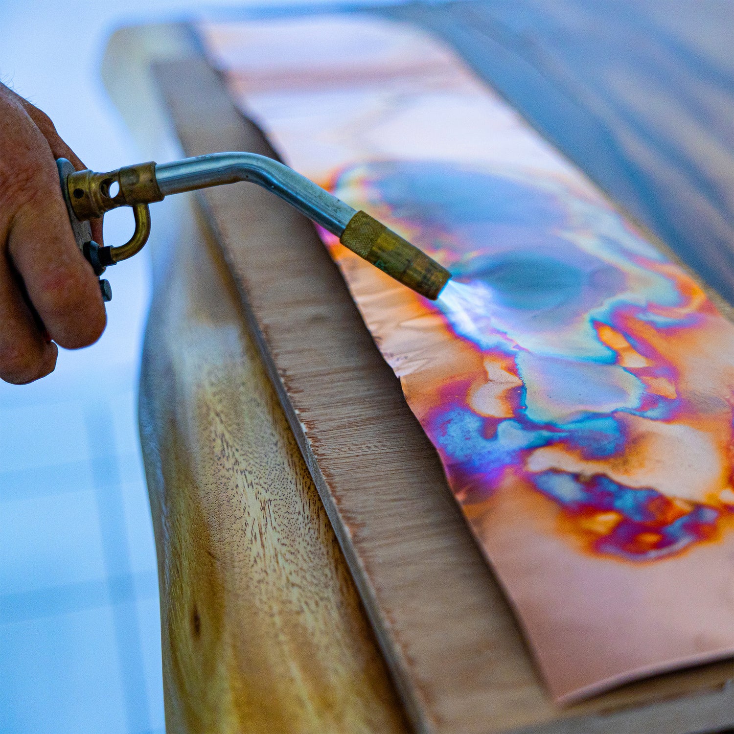 When metal artist and furniture designer Josh Alexander provides heat to metal, the electrons continuously excite and deexcite, providing different wavelengths of light. Flame painting exposes the colorful copper spectrums that are artfully displayed and available to you.